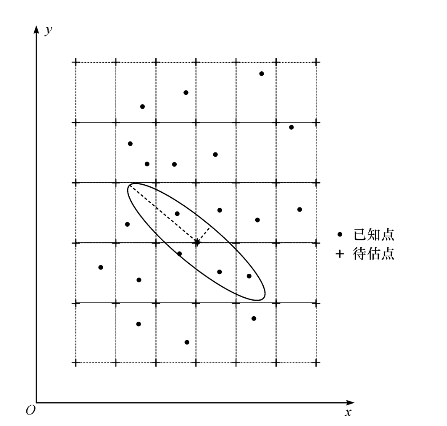 空间变量结构特征的理论模型可直接用于克里金插值中。对于一个未知位置而言,对其属性值的估计是在有限邻域内进行的,该搜索邻域由空间变量的最大连续性和最小连续性方向的长距离和短距离来定义,如图4-6所示。图4-6中,椭圆是被估计节点(交叉红点)的邻域搜索边界。
