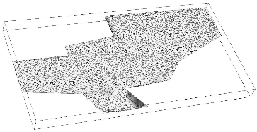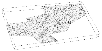以北京市顺义新城(1)层人工填土为例,在建模中,原始采样点直接生成的层面如图4-8所示。从图4-8中可以看出,剖分网格比较大,地层层面起伏处棱角尖锐。由克里金法插值后的点生成的层面如图4-9所示,可以看出,剖分网格小而密,地层层面起伏处较平缓,能较好地反映地层实际情况。