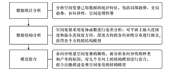 克里金插值是地质统计学分析的一个步骤。地质统计学(geostatistics)于20世纪50年代初开始形成,20世纪60年代,是在法国著名统计学家乔治斯·马瑟龙(Georges Matheron)的大量理论研究工作基础上形成的一门新的统计学分支。由于它首先是在地学领域,如采矿学、地质学等中发展和应用的,因此得名地质统计学。地质统计学的特点是它研究的变量不是纯随机变量,而是空间变量。地质统计学中的空间变量具有四个特点:①该空间变量根据其在一个域内的空间位置不同而取不同的值,它是随机变量与位置有关的随机函数,因此它既有随机性又有结构性;②地质统计学研究的变量不能进行如经典统计学变量一样的重复试验,因为空间变量一旦在某一空间位置上取得一个样品后,就不可能在同一位置再次取到该样品;③空间变量是在空间不同位置取样,因而相邻样品中的值不一定保持独立,会具有某种程度的空间相关性;④地质统计学除了要考虑样本的数字特征外,更主要的是研究空间变量的空间分布特征,因此,地质统计学研究主要围绕着变量空间分布理论和估计方法。典型的地质统计学分析过程如图4-2所示。