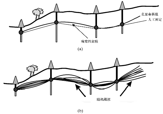 基于随机模拟理论的随机建模方法,即用随机变量和概率分布模拟未知部位。该理论于20世纪90年代开始应用于三维储层模拟(Johann,1996),2000年之后在其他领域的地质建模中得到发展。随机建模方法模拟地质特征的多个实现,可以通过对多个实现的统计分析计算出模型的不确定性。随机建模方法已发展出多种相关方法,如类比法(analog method)、概率法(probability modeling method)、多高斯克里金法(multi-Gaussian kriging)(Afzal et al.,2015)等。在现有地质资料不完善的条件下,随机模型比确定性模型更贴近“真实”,也更有利于模型的不确定性定量评价,如图4-14所示。