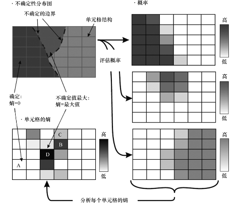 基于信息熵的模型评价基本步骤(见图4-18)包括:①将地质体分割成六面体单元组;②计算每个单元格中每种变量(如地质界面、属性参数等)出现的概率(对随机建模的多个实现进行概率统计);③计算每个单元格的信息熵;④在污染土体边界动态演化的基础上,计算模型信息熵随时间的动态演化,分析模型不确定性的动态演化特征。理论上,在一个确定的位置上只能出现一种确定的地质体,这符合信息熵理论的前提。信息熵的计算公式为其中,x 代表某一个体元的位置,M 代表研究区域地质体的数量,p m代表某一地质体出现的概率,t代表地质演化的时间。