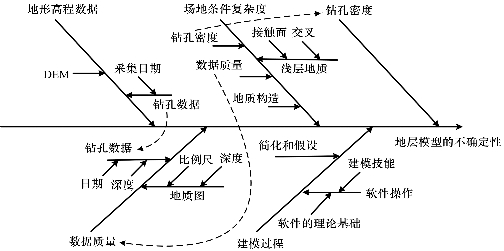图4-17 城市工程建设层三维建模的不确定性来源及其属性关系分析鱼骨图