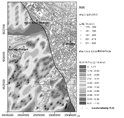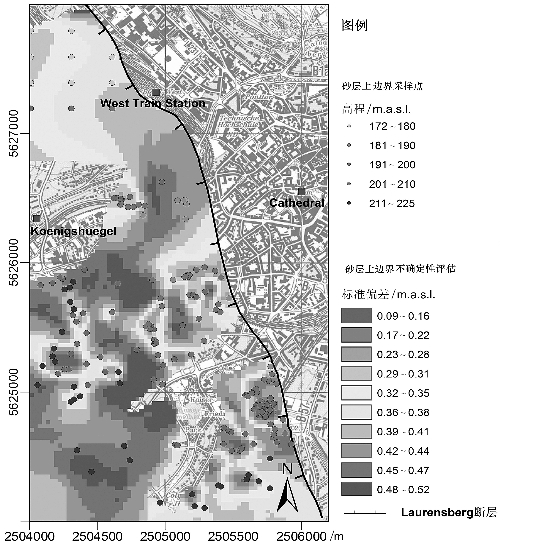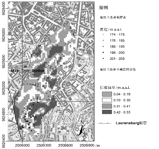 图5-25 主火车站地区的Hergenrath地层上边界由地质条件复杂性和插值过程引起的不确定性值