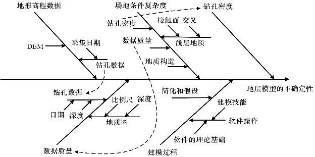 量化评估模型质量的第一个步骤是明确不确定性产生的原因,其次是确定关键因素并考虑各因素之间的关系。地质条件或岩土性质的不确定性可以分为随机(偶然)不确定性和主观(认识论)不确定性两种。随机不确定性代表研究对象的自然随机性,它可用空间变异性的函数来表示,这种不确定性无法减少或消除。主观不确定性是由信息缺乏、测量及计算手段的缺陷引起的(Lacasse et al.,1997)。未知的参数是根据有限的采样数据进行估算的,因此存在采样不确定性。测量不确定性是由测试仪器、量化方法、数据记载、现场调查人员的专业程度的不确定引起的。通过搜集更多数据、改进建模或测量方法可减少主观不确定性。因此,目前可以从两个方面对区域尺度三维地质模型的不确定性来源进行探讨。引起研究区三维地质模型不确定性的所有因素及各因素之间的关系如图5-21所示,其可以作为不确定性来源因素的概念模型。