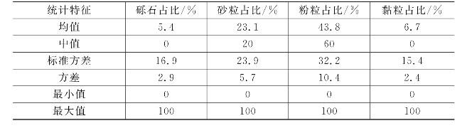 在研究区中,土颗粒粒径分数数据呈现离散和不完整的形式。考虑到采样点的平均间隔距离,在构建三维土壤粒级分数模型时,将第四纪沉积物的三维地质模型向东方向分为200个×200个×3个的六面体体元结构。因此,整个第四纪沉积物的SGrid模型含有120 000个单元格。将钻孔记录中的砾石、砂粒、粉粒和黏粒的百分比值分配在最接近它们实际位置的单元的中心,每种土的描述性统计资料如表5-6所示。