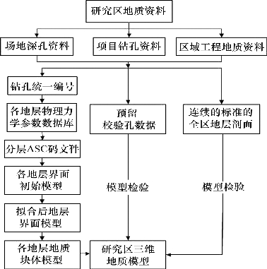 三维地质模型一般包括点、线、曲面、交线、块体、网格等几个要素,它的主要数据来源是野外钻孔。由于对区域和模型精度的要求不同,建模的第一个步骤是对这些原始数据进行分析和预处理。建模的流程如图5-34所示。
