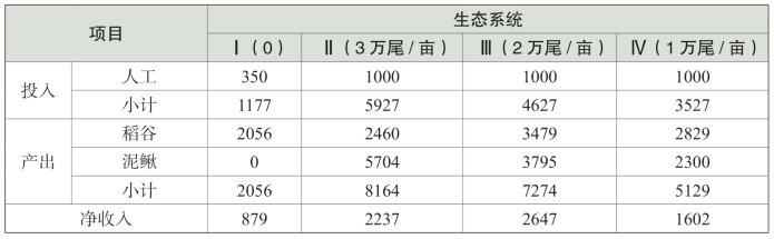 不同处理的养殖生产投入与产出效益分析见表9,从表中可以看出,稻鳅共生系统增加了养殖泥鳅的成本,需要投放鳅苗、饵料、人工饲养费等,但稻鳅共生系统依靠泥鳅在稻田的活动可以一定程度上控制稻田病虫害,并提高土壤肥力,从而使得稻谷因为种植面积减少而产量下降的趋势降低,甚至有所提高。按2016年市场价格,稻谷的售价为5.2元/千克,泥鳅的售价为23元/千克,因此泥鳅产出效益较高,并随养殖密度的增大而增大。处理Ⅱ、Ⅲ、Ⅳ的每亩净收入分别比处理Ⅰ高出了93.0%、120.4%、50.5%,相当于每亩分别高出1391元、1801元、756元,经济效益明显增加。