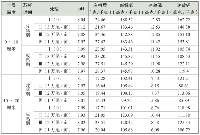 氮、磷、钾是肥力的三要素,土壤碱解氮、速效磷、速效钾是土壤供肥的强度指标,对土壤化学性质有重要影响。不同处理在水稻分蘖期和成熟期的肥分变化见图8。从图中可以看出,对于0~10厘米土层,从分蘖期到成熟期,土壤有效养分都出现降低,水稻植株在生长过程中吸收和利用养分,土壤肥力下降。但不同试验处理降低幅度不相同,稻鳅共生系统比水稻单作系统降低幅度要小,但不同养殖密度的稻鳅共生系统之间比较,降低幅度差异不大。对于10~20厘米土层,从分蘖期到成熟期,水稻单作系统中土壤有效养分都出现降低,但降低幅度小于上层(0~10厘米),而稻鳅共生系统中土壤有效养分略有升高,但不同养殖密度的稻鳅共生系统之间比较,变化幅度差异不大。受土壤质地、结构、组成和营养元素本身特性以及泥鳅活动的影响,土壤中营养元素具有明显的垂直分布差异。稻鳅共生系统中,由于泥鳅在稻田的活动,不仅有效促进了土壤养分的释放,而且泥鳅的排泄物以及残余饵料都一定程度地增加了土壤养分含量。试验表明稻田养鳅具有提高水稻田土壤肥力的作用。
