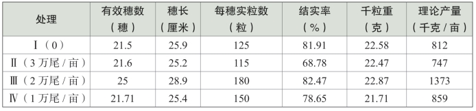 2016年11月5日收割水稻,水稻的生长期为147天。处理Ⅲ和Ⅳ稻谷产量比处理Ⅰ提高了30.2%和5.8%,处理Ⅱ产量比处理Ⅰ略有减少。这主要因为生长后期处理Ⅰ稻穗出现绿霉。试验结果表明,稻鳅共生可提高水稻产量,泥鳅养殖密度为2万尾/亩时,稻谷产量最高,达到669千克/亩。