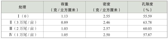 土壤容重是衡量土质疏松程度的重要物理指标之一,受质地结构、松紧度和土壤有机质含量等影响而发生变化,影响土壤孔隙度与孔隙度大小分配和土壤的穿透阻力,进而影响到土壤水肥气热条件与作物根系在土壤中的穿插。容重小表示土壤疏松多孔,容重大则表明土壤紧实板硬,结构性较差。由表2可知,由于泥鳅在稻田钻动寻食,对稻田土壤起到中耕作用,有效疏松土壤,使土壤结构得到合理改善,不同养殖密度的生态系统土壤容重均小于对照,实验处理Ⅱ、Ⅲ、Ⅳ分别比Ⅰ减少了21.2%、8.8%、7.1%,且养殖密度越大容重越小,表明稻鳅共生稻田土壤结构良好,疏松多孔,有利于土壤内外物质的交换。不同养殖密度的生态系统土壤孔隙度也均大于对照,试验处理Ⅱ、Ⅲ、Ⅳ分别比Ⅰ增加了14.7%、8.0%、4.1%,且养殖密度越大孔隙度越大,表明稻鳅共生更有利于土壤结构的改善,有利于土壤通气性条件的改善。总之,进行稻鳅共生后由于泥鳅在稻田的作用有效降低了土壤容重,改善了土壤通气性,从而使土壤结构得到有效改善,能够同时满足作为对水分和空气的要求,有利于养分状况调节和植物根系伸展,促进水稻的生长发育。但是泥鳅养殖密度对土壤物理性状的改变不明显。