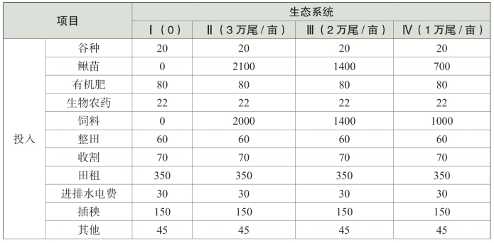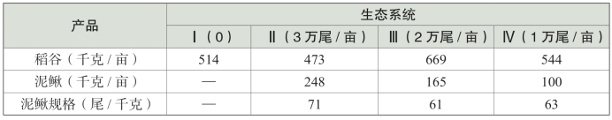 稻鳅共生产品有稻谷和泥鳅。2016年9月17日开始捕捞泥鳅,泥鳅经过82天的生长,体长在12厘米以上。在稻—泥鳅田生态系统中,泥鳅是次级生产者。泥鳅主要靠摄食饵料生长。泥鳅捕捞结果表明,随着鳅种投放密度增加,残饵越来越显得不足,泥鳅生长逐渐受到影响,单体重减少。但在一定密度范围内,鳅种投放密度大,泥鳅产量亦高,单体重亦小。投放鳅种3万尾/亩时,泥鳅产量为248千克/亩,每条泥鳅重14.1克;投放鳅种2万尾/亩时,泥鳅产量为165千克/亩,每条泥鳅重16.4克;投放鳅种1万尾/亩时,泥鳅产量为100千克/亩,每条泥鳅重15.9克。总的来看,泥鳅的单条重量偏低,这主要因为本次泥鳅的生长期82天偏短,如果延迟100天以上,泥鳅的产量还可以再提高。各生态系统的产品产量与规格见表6。