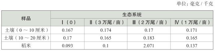 根据有关调查,试验稻田所在区域土壤的成土母质属于第四纪冲湖沼沉积物和湖积冲积物,质地为均质中壤,土壤中硒含量较高,可以生产富硒大米。因此,本次试验中对各处理组中的土壤和稻米分别取样分析,结果见表5。由表5可见,不同土层的硒含量没有显著差异,浓度在0.165~0.183毫克/千克之间,均值0.171毫克/千克,属于低硒土壤。各处理组土壤的硒含量也没有显著差异。处理Ⅰ、Ⅱ、Ⅳ产出的稻米中硒的含量差异不明显,浓度在0.093~0.137毫克/千克之间,均值0.110毫克/千克,属于富硒稻米。而处理Ⅲ在种植过程中施用了含硒的叶面肥,导致稻米硒浓度高达2.071毫克/千克,属于硒过量,存在食用不安全性的问题。从土壤浓度上分析,试验区土壤低硒,由于该区域的土壤呈偏碱性,有利于土壤中的硒向农作物中转化,因此该区域产出的大米可以达到富硒标准,不需要额外施用硒肥。