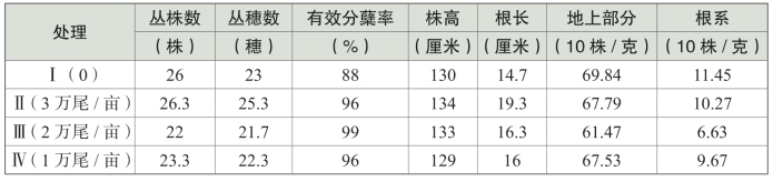 水稻成熟时测定了株高、丛株数、丛穗数、地上和地下部分生物量以及根长等,试验结果见表1。试验表明,水稻生长发育一定程度上受到泥鳅养殖的影响。各生态系统中水稻株高在129~134厘米之间,其中,处理Ⅳ(养殖密度为1万尾/亩)的系统与处理Ⅰ(水稻单作)系统株高相当,约为130厘米,处理Ⅱ(养殖密度为3万尾/亩)和Ⅲ(养殖密度为2万尾/亩)的系统株高约为134厘米,比前二者高出3%,表明水稻长势优于前二者。不同养殖密度的生态系统中水稻的有效分蘖率均在96%以上,比水稻单作高出8%~11%,但不同养殖密度的稻鳅生态系统之间的差异不明显。不同养殖密度的生态系统中水稻根长在16.0~19.3厘米,比水稻单作高出8.8%~31.3%,其中,处理Ⅱ中水稻根最长。说明稻鳅共育模式下水稻根系较为发达。这是由于泥鳅在稻田中不断活动,起到了中耕松土搅浑田水的作用,对水稻根系有着直接的刺激作用,既疏松了表土,又能增加田水和土壤中的含氧量,加快了水稻根系有害气体排出,提高了土壤通透性,促进了根系生长。