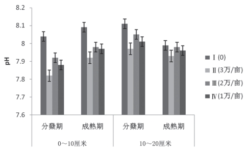 试验中各稻鳅共生和水稻单作稻田土壤pH的变化见图6。从图中可以看出,0~10厘米土层中,处理Ⅱ、Ⅲ、Ⅳ的pH差异较小,在7.92~7.98之间,均值为7.96,略小于处理Ⅰ。10~20厘米土层中,4个处理间pH差异较小,在7.93~8.02之间,均值为7.98,与0~10厘米土层pH相比差异也不大。试验结果表明养殖泥鳅对稻田土壤pH影响不大,试验区域土壤偏碱性。