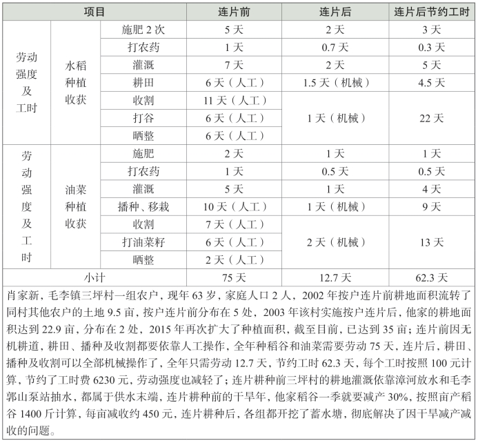 按户连片耕种前,一些分散、碎片的田块农机操作不便,全靠传统的人工耕种。按户连片耕种后,机械化作业率大幅提高,农活劳动强度大的困境迎刃而解。如三坪村村民肖家兴,家有9亩田,过去分散在5个不同的区域,无法进行农机作业,每到农忙,“跑断腿、压弯腰”;按户连片耕种后,全部实行机械化作业,目前种35亩田仍觉得比较轻松。过去承包9亩田,基本不赚钱;现在种35亩田,再加上提供农机服务,每年纯收入8万多元。