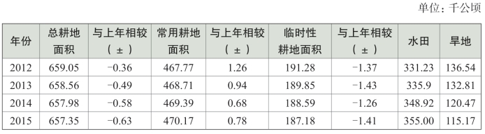 荆州市国土总面积14067平方千米。2015年,全市总耕地面积657350公顷,年内减少630公顷,其中国家基建占地170公顷、其他基建占地30公顷、退耕还林还草30公顷、退耕还园地10公顷,其他用地390公顷。常用耕地面积470170公顷,较上年增加780公顷,占总耕地面积71.53%,其中水田355000公顷,旱地115170公顷;其次为临时性耕地187180公顷,占比28.47%。(见表1)