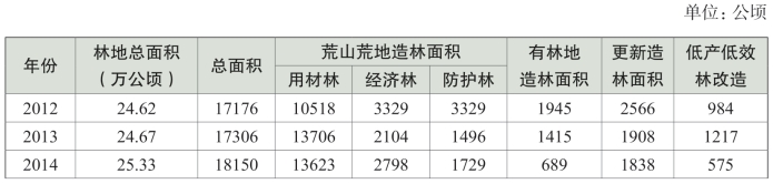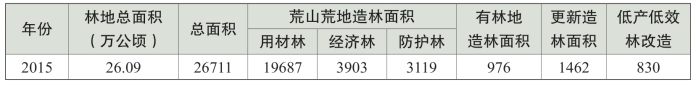 2015年,全市林地总面积为260900公顷,其中,农用林地面积为106100公顷。荒山荒地造林面积26711公顷,比上年增加8561公顷,其中,用材林19687公顷、经济林3903公顷、防护林3119公顷;有林地造林面积976公顷;更新造林面积1462公顷;低产低效林改造830公顷。(见表2)