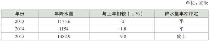 2015年荆州市平均降水量1382.9毫米,比上年增加228.9毫米,增幅达19.8%,比常年偏多16.5%,为偏丰水年份。(见表3)