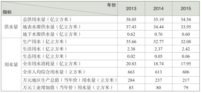 2015年全市总供水量为34.5550亿立方米,连续三年呈现下降趋势。在供水量中,地表水源供水量33.9484亿立方米,地下水源供水量0.6066亿立方米;在用水量中,生产用水32.0765亿立方米,生活用水2.4173亿立方米,生态用水0.0612亿立方米。2015年全市用水消耗量17.9482亿立方米,耗水率51.9%。全市人均综合用水量606立方米,万元地区生产总值(当年价)用水量217立方米,万元工业增加值(当年价)用水量79立方米。(见表6)