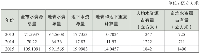 2015年全市水资源总量105.1091亿立方米,较上年度增加49.7%。其中地表水资源量99.1565亿立方米,比常年偏多41.6%;地下水资源量19.9983亿立方米。人均水资源占有量1842立方米,耕地亩均水资源占有量1490立方米,两者分别比上年增加50.7%、109.6%。(见表4)