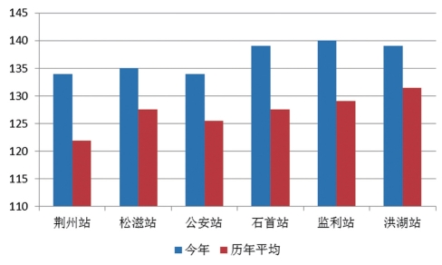 2015年荆州市各站降水量为1241.1~1610.1毫米,其中,松滋站最低为1241.1毫米,洪湖站降水最多为1610.1毫米。各站与历年平均相比均偏多,松滋站正常略偏多,石首站、监利站和洪湖站偏多1成,荆州站偏多2成,公安站偏多3成。(见图2)