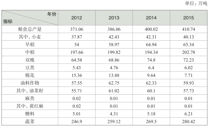 表11 2012—2015年荆州市度主要农作物产量一览表