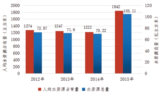 2015年全市水资源总量为105.11亿立方米,较上年增加34.89亿立方米,人均水资源占有量为1842立方米,较上年增加了620立方米。通过图7可以看出,自2012年到2014年,全市水资源总量和人均占有量基本上处于持平阶段,呈现小幅度波动,而2015年两者数量呈现大幅度上升,这与该年全市降水偏多有关,2015年全市年降水量达1382.9毫米,较上年增幅达19.8%,属于降水偏丰年份,直接导致全市水资源量特别是地表水资源量迅猛增加。