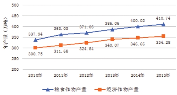 2015年荆州市粮食作物产量达410.74万吨,稳居全省市州首位。水稻是粮食作物的主要来源,年产量达340.35万吨,其次为小麦,年产量达40.13万吨,大豆和玉米排其后。2015年荆州市经济作物年产量达354.28万吨,其中以油菜籽为代表的油料作物占经济作物面积的56.5%,其次为棉花、蔬菜等。荆州市充分发挥本地地理优势,大力发展水稻、油菜等作物,近六年来,荆州市粮食作物和经济作物实现连年增产,其中粮食作物由2010年的337.94万吨增加到2015年410.74万吨,经济作物产量由2010年的300.75万吨增加到2015年的354.28万吨,并且农作物单产也在稳步上升,较好地促进了荆州由农业大市向农业强市转变。(见图8)