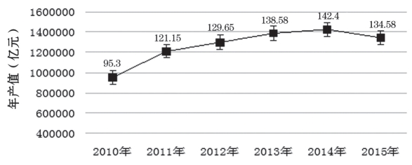 荆州市近些年重点建设优质畜禽产品生产基地,加快畜禽良种繁育,同时加快发展畜禽深加工产业,全市畜牧业快速发展。据荆州市国民经济和社会发展统计公报2010—2015年显示,近六年来,全市畜牧业产值呈现快速上涨趋势,从2010年的95.3亿元增加到2015年的134.58亿元,增幅达41.2%。荆州市在畜牧业发展上积极调整思路,以畜牧大乡、大户为主体,推进规模化养殖,提高畜牧发展效率。2015年,全市生猪和家禽规模化养殖户分别达到2815家和1644家,其中生猪存出栏数分别达到1699585头和3206421头;牛和羊规模养殖户也分别达到81家和103家,他们在提升全市畜牧业整体发展水平方面起到了非常大的作用,全市畜牧业总产值呈现连年上升趋势。(见图11)