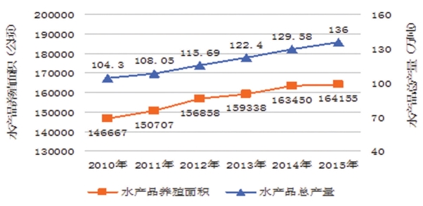 荆州市充分发挥水优势,大力发展水产产业,全市现有水域面积354000公顷,2015年水产品养殖面积达164155公顷,占全市水域面积的46.4%,并且该比例正在逐年上升。近年来全市大力实施“精养鱼池标准化改造增效工程”,稳步推进鱼池改造、新塘开挖工作,渔业放养面积逐年稳定增长。近六年来,全市水产品养殖面积和水产品产量以及年产值呈现快速上升趋势,2015年水产品养殖面积较2010年增加17488公顷;水产品总产量为136万吨,较2010年增加31.7万吨,年产值达2094048万元,占全市农林牧渔业总产值的33.2%。总体而言,荆州市水产业发展态势良好,正逐步由传统渔业向现代渔业迈进,但依然存在不少问题,渔业小户经营、水产品加工业较弱、市场信息不畅通等制约着荆州市水产业的发展,尤其是产业经营主体的单薄性和产业链不健全使得荆州市水产业缺少核心带动力,需要进一步地完善和改进。(见图9、图10)