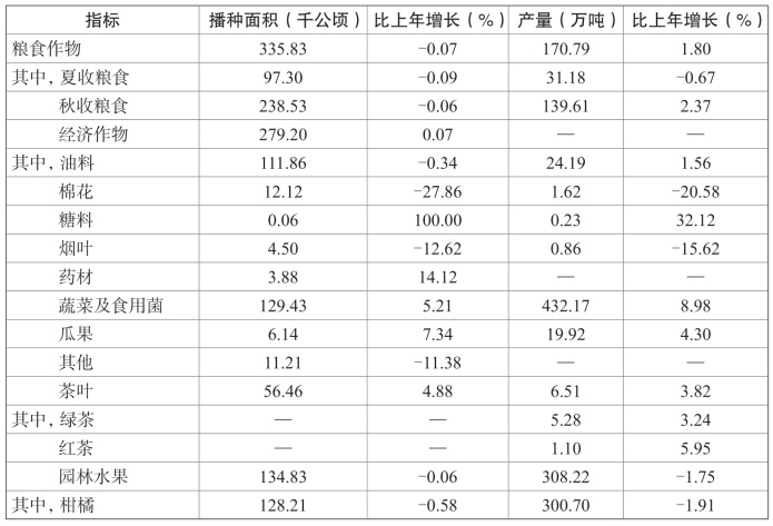 2015年,全市农业产值318.37亿元,按可比价格计算,比上年增长5.11%,其中,谷物及其他作物69.90亿元,蔬菜、食用菌及花卉盆景园艺产品128.96亿元,水果、坚果、茶、饮料和香料113.10亿元,中草药材6.41亿元。全市农业增加值193.60亿元,按可比价格计算同比增长4.51%。全市农作物播种面积615.03千公顷,比上年略减0.04千公顷。2015年粮油棉总产“二增一减”,即粮食(以稻谷、玉米为主)实现“十二连增”,油料在2014年同比小幅减产后再次实现增产,棉花继续大幅减产,单产却是“三增”。其他农产品产量也是有增有减,其中蔬菜、糖料、瓜果、茶叶增产幅度较大,而烟叶减幅较大。2015年园林水果(含柑橘)在2014年同比增产的基础上受气候影响则有所减产,但水果价格行情好,水果减产不减收。具体生产情况见表1。