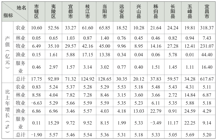 2015年全市农林牧渔业总产值617.68亿元,比上年增长5.20%,比2010年(“十一五”期末)增长了110.06%,年均增长16.01%;全市农林牧渔业增加值370.31亿元,比上年增长5.10%,比2010年增长了109.81%,年均增长15.98%;全市农村常住居民人均可支配收入12990元,比上年增长9.74%,比2010年增长了117.22%,年均增长16.79%。我市农业整体呈现稳中向好的发展局面。在全市农业总产值中,当阳市、枝江市、夷陵区的农业总产值占据了半壁江山。2015年除市辖区(西陵区、伍家岗区、点军区、猇亭区)的牧业产值、农业总产值、秭归县的服务业产值同比下降外,其他产值同比都是增长的。除市辖区外,其他县市农业总产值的增幅相差不大,都在竞相发展。各县市农业总产值的具体情况见表2。