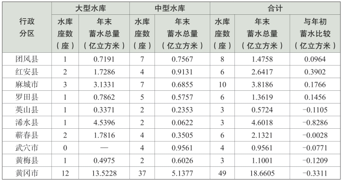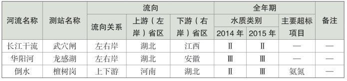 (4)省界水体水质。2015年,全年期省界水体评价3个断面,其中长江干流武穴闸断面水质为Ⅱ类,华阳河龙感湖省界断面水质为Ⅲ类。