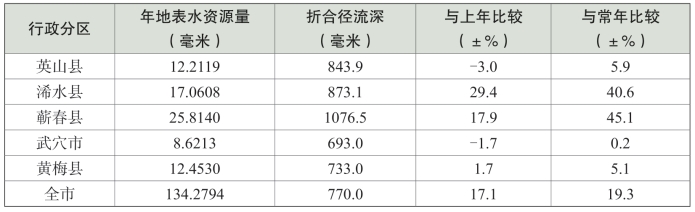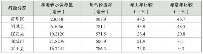 (2)地表水资源量。地表水资源量指河流、湖泊等地表水体的动态水量,即天然河川径流量。2015年全市地表水资源量134.2794亿立方米,折合径流深770.0毫米,比2014年偏多17.1%,比常年值偏多19.3%。全市十县市地表水资源量与常年比较均偏多,其中以团风县为最,比常年偏多达48.5%,其次为黄州区,比常年偏多46.7%。