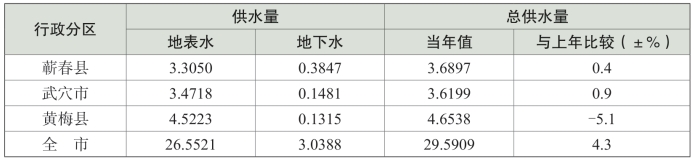 2015年,全市总供水量29.5909亿立方米,其中地表水源供水量26.5521亿立方米,占总供水量的89.7%,地下水源供水量3.0388亿立方米,占总供水量的10.3%。与上年比较,总供水量增加1.2117亿立方米,其中地表水源供水增加0.8097亿立方米,地下水源供水增加0.4020亿立方米。