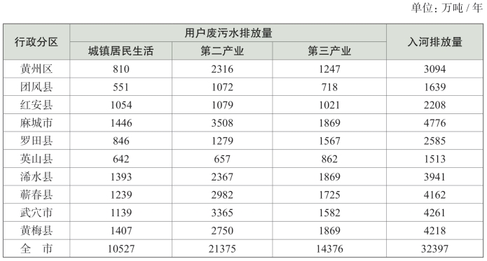 2015年,全市废污水排放总量4.6278亿立方米(不包括火电直流冷却水),其中第二产业(主要是工业废水)为2.1375亿立方米,占46.2%,城镇生活污水1.0527亿立方米,占22.7%,第三产业废污水1.4376亿立方米,占31.1%。全市废污水入河量为3.2397亿立方米。