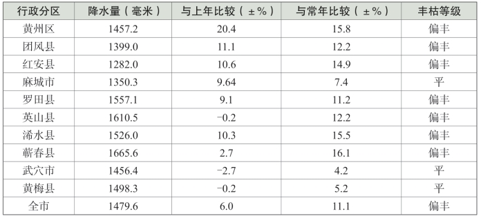 与常年比较,全市降水量均偏多,其中蕲春县偏多16.1%,黄州区偏多15.8%,其他县市分别偏多在4.2%~15.5%之间。