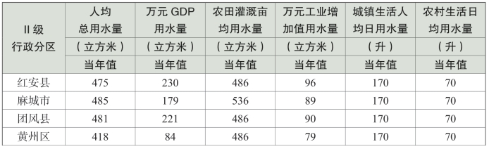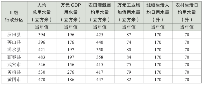 (4)用水指标、用水效率。2015年,全市人均用水量470立方米,农田灌溉亩均用水量447立方米,全市万元国内生产总值(当年价)用水量186立方米,万元工业增加值(当年价,含火电)用水量为82立方米,城镇人均生活用水量170升/吨,农村人均生活用水量70升/吨。因受经济结构、人口密度、作物组成、工业结构、节水水平、水资源条件等各种因素的影响,各县市用水指标值存在一定差异,用水指标见表10。