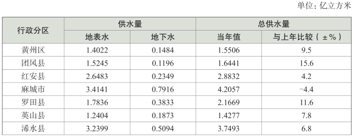 2015年,全市入境水量6871亿立方米,比上年减少5.4%,比常年减少9.1%,其中长江干流入境水量为6869亿立方米,滠水(孝感大悟县)入境为0.6167亿立方米,倒水(河南新县)入境为0.9025亿立方米,举水(河南新县)入境水量为0.3074亿立方米。