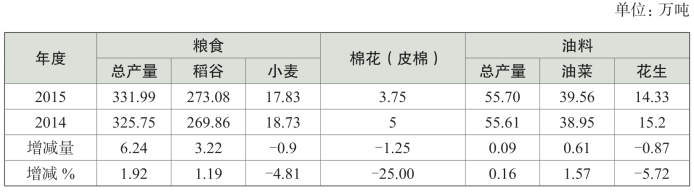 2015年,全市粮食作物面积544.22千公顷,粮食总产量331.99万吨,较上年增长1.92%。其中,稻谷产量273.08万吨,增产1.19%,小麦17.83万吨,减产4.81%。