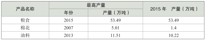 2015年,全年农作物总播种面积211.59万亩,复种指数195.4%。其中,全年粮食面积115.56万亩、总产53.49万吨,增长0.41%,实现了自2004年以来连续第十二年增产;棉花面积13.52万亩、总产1.4万吨,减32.84%,棉花生产因国家取消收储政策,价格大幅降低,生产效益跌至2000年以来的最低谷;全年油料面积52.40万亩、总产10.22万吨,减6.7%;蔬菜总产74.36万吨,增长4.6%;水果总产4.06万吨,增长13.7%。粮棉油最高产量情况,见表1。