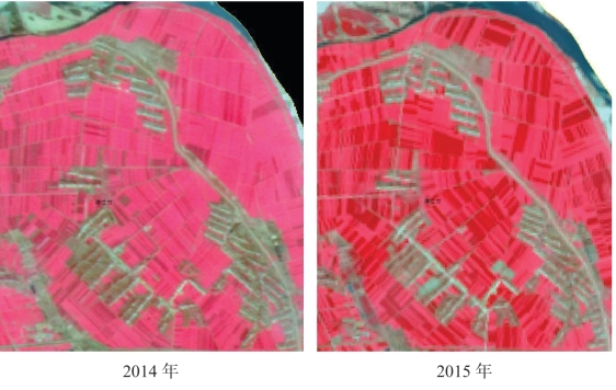 本年度冬小麦面积增加,主要是由油菜改种小麦,在江汉平原地区表现的较为明显,如下面的对比图像,见图10,去年种植油菜的区域在今年明显改种了小麦。图中粉红色的是油菜,红色的是冬小麦,从图中可以看出,在2015年的影像中,相比上一年度红色的区域面积增加,粉色区域面积明显减少。