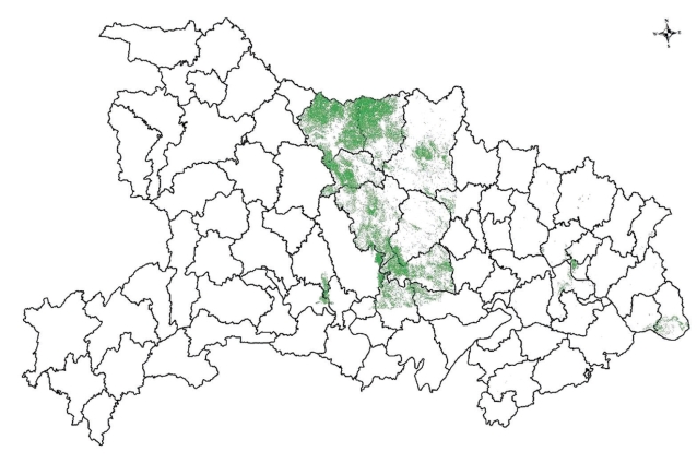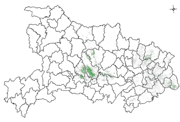 此外,本年度监测区域的冬小麦种植面积占全省种植面积的80%以上,因此,本次监测结果能够较好地代表全省冬小麦种植面积的变化趋势。湖北省冬小麦种植面积空间分布见图6、图7。