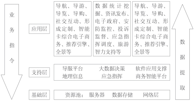 智慧旅游云服务体系的核心在于通过智慧旅游云服务平台,为用户群体提供“基础设施即服务、平台即服务、软件即服务”的各类云服务。其基本架构是以基础层、支持层和应用层为基础,通过基础层将旅游资源进行集成和分布式处理,通过支持层将旅游资源进行框架复用化和虚拟化处理,通过应用层将旅游资源进行定制化和可租用化处理。