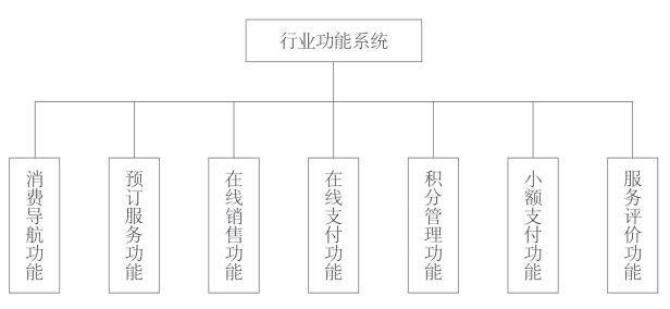智慧旅游公共服务平台的行业服务主要面向的对象是旅游社、旅游商品销售企业、餐饮住宿企业等旅游行业相关企业。目前,沈阳各相关企业在电子商务服务方面相对滞后,企业多数只是建立了网站,提供一些基本信息介绍等内容,没有完全实现真正的电子商务和行业服务功能,进而无法满足智慧旅游所要求的游客“网上旅游”和购物的各类需求。因而,为弥补该类缺陷,可以通过智慧旅游公共服务平台的行业功能系统改变这一状况。该类系统包括:消费导航、预订服务、在线销售、在线支付、小额支付功能、积分管理、服务评价等多种功能服务。具体结构图如下: