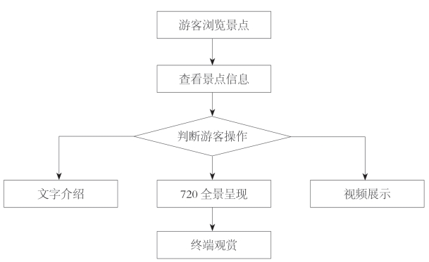 多种形式的景区展示,不仅能为游客带来不同视觉效果的冲击,而且可以更全面、多角度的呈现景区的风景和人文特点。景区景点配以文字的说明,语音视频的表述,再加上720全景的展示,让景区呈现多元化的状态,让观看的游客有身临其境之感,成为吸引游客的一大亮点。旅游展示功能流程图如下: