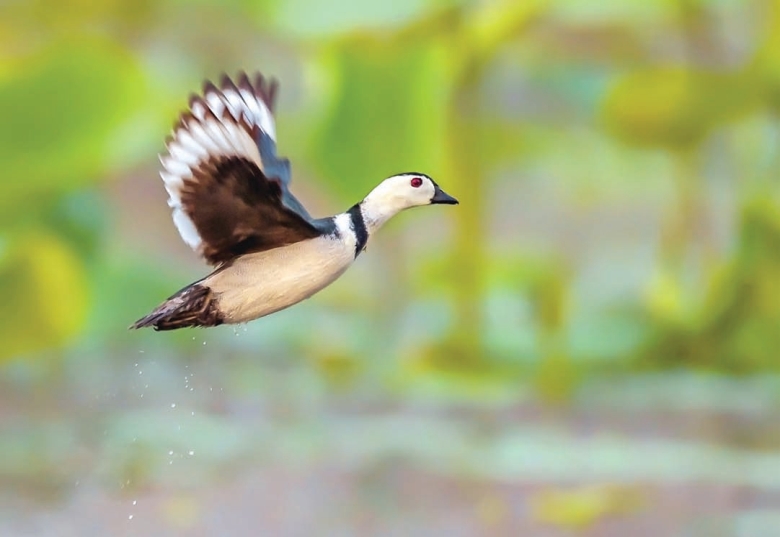 雄鸟前额白色,额及头顶黑褐色,头的余部和颈白色,颈基部有一宽的黑色而闪绿色光泽的颈环。肩、腰以及翼上覆羽黑褐色,具金属绿色光泽;大覆羽绿色金属光泽尤为显著。初级飞羽黑褐色,各羽中部白色,形成大的白色翼斑;次级飞羽黑褐色,具绿色光泽和白色端斑;三级飞羽黑褐色,略具紫蓝色光泽。尾上覆羽及两胁白色,有黑色虫蠧状细斑。腋羽及翼下覆羽黑褐色。尾羽暗褐色,有不显著的绿色金属光泽,羽缘浅棕色;尾下覆羽白色而具褐色端斑,其余下体白色。