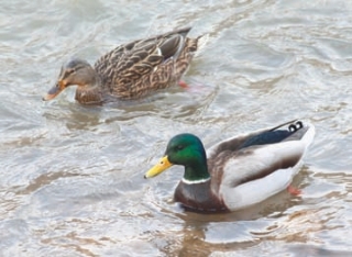 雌鸟头顶至枕部黑色,具棕黄色羽缘;头侧、后颈和颈侧浅棕黄色,杂有黑褐色细纹;贯眼纹黑褐色。上体黑褐色,具棕黄或棕白色羽缘,形成明显的“V”形斑。翼似雄鸟,具紫蓝色翼镜。颏和前颈浅棕红色,其余下体浅棕色或棕白色,杂有暗褐色斑或纵纹。尾羽淡褐色,羽缘淡黄白色。