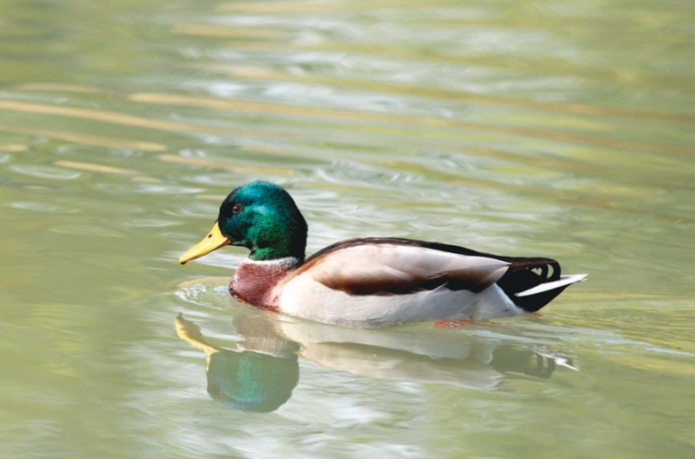 雄鸟头、颈绿色,具辉亮的金属光泽;颈基有一白色领环。上背和两肩褐色,密杂以灰白色波状细斑,羽缘棕黄色;下背黑褐色,腰和尾上覆羽绒黑色,微具绿色光泽。中央两对尾羽黑色,向上卷曲成钩状;外侧尾羽灰褐色,具白色羽缘;最外侧尾羽大都灰白色。翼灰褐色,翼镜呈金属紫蓝色,其前后缘各有一条绒黑色窄纹和白色宽边。颏近黑色;上胸浓栗色,具浅棕色羽缘;下胸和两胁灰白色,杂以细密的暗褐色波状纹;腹部淡色,亦密布暗褐色波状细斑。尾下覆羽绒黑色。