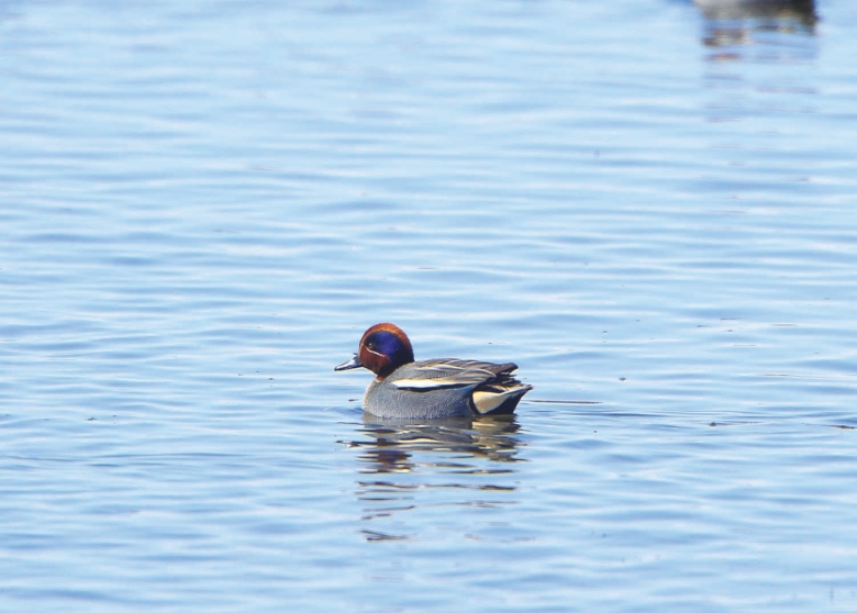 雄鸟繁殖羽头和颈深栗色,自眼周往后有一宽阔具有光泽的绿色带斑,经耳区向下与另一侧的带斑相连于后颈基部;自嘴角至眼有一窄的浅棕白色细纹,在眼前分别向眼后绿色带斑上下缘延伸,在头侧栗色和绿色之间形成一条醒目的分界线。上背、两肩的大部分和两胁均为黑白相间的虫蠧状细斑;下背和腰暗褐色,羽缘较淡。肩羽外侧乳白色或淡黄色,外翈具绒黑色羽缘;翼表面大都为暗灰褐色。大覆羽具浅棕色或白色端斑;次级飞羽外侧数枚外翈绒黑色,内侧数枚外翈为金属翠绿色,在翼上形成显著的绿色翼镜。大覆羽的白色端斑在翼上形成两道明显的白色带,分别位于翼镜的前后缘。